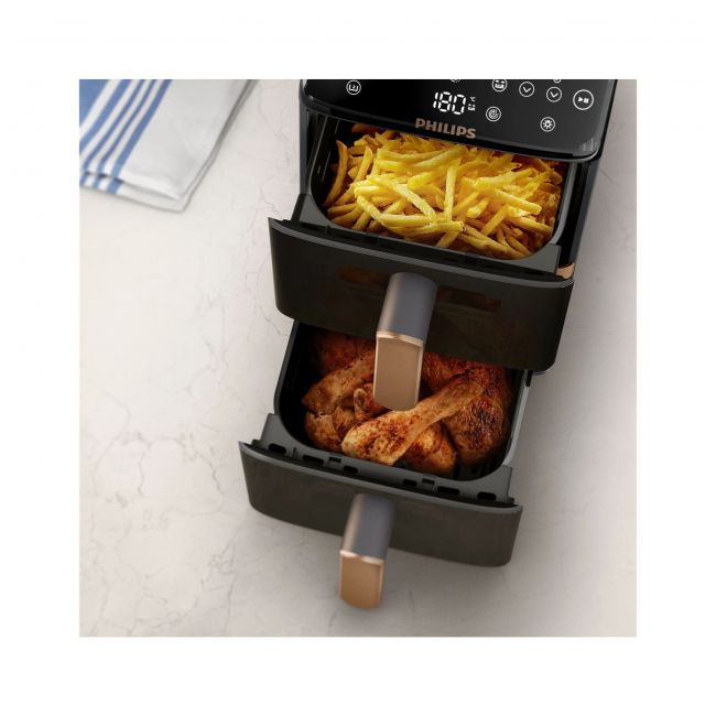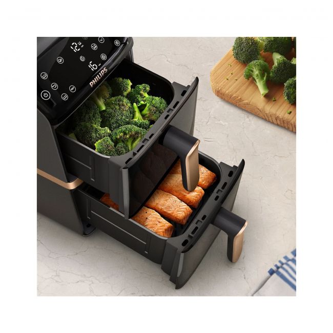 Nasz pionowy Philips Ovi z dwoma koszami pozwala przygotować dwa pełne posiłki jednocześnie, oszczędzając miejsce. Co więcej, dzięki technologii Vertical RapidAir smak posiłków jest zawsze niezwykle wyraźny i delikatny.